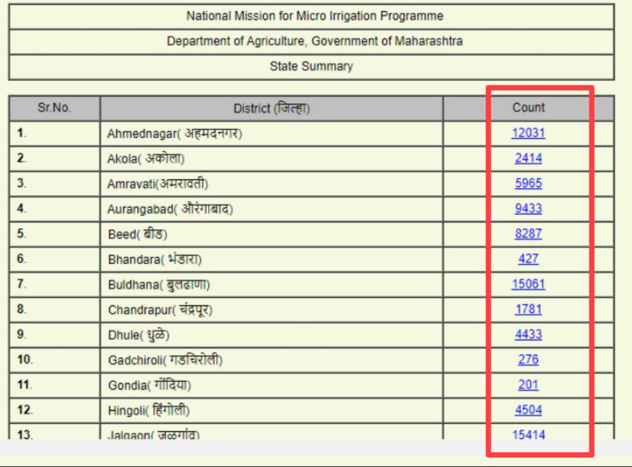 View Report या option वर क्लिक केल्यावर आता आपण आपल्या राज्यातील लाभार्थी यादी चा सारांश पाहू शकता. व नंतर तुमच्या जिल्ह्याच्या नावासमोर Count कॉलमच्या नंबरवर क्लिक करायचे आहे.