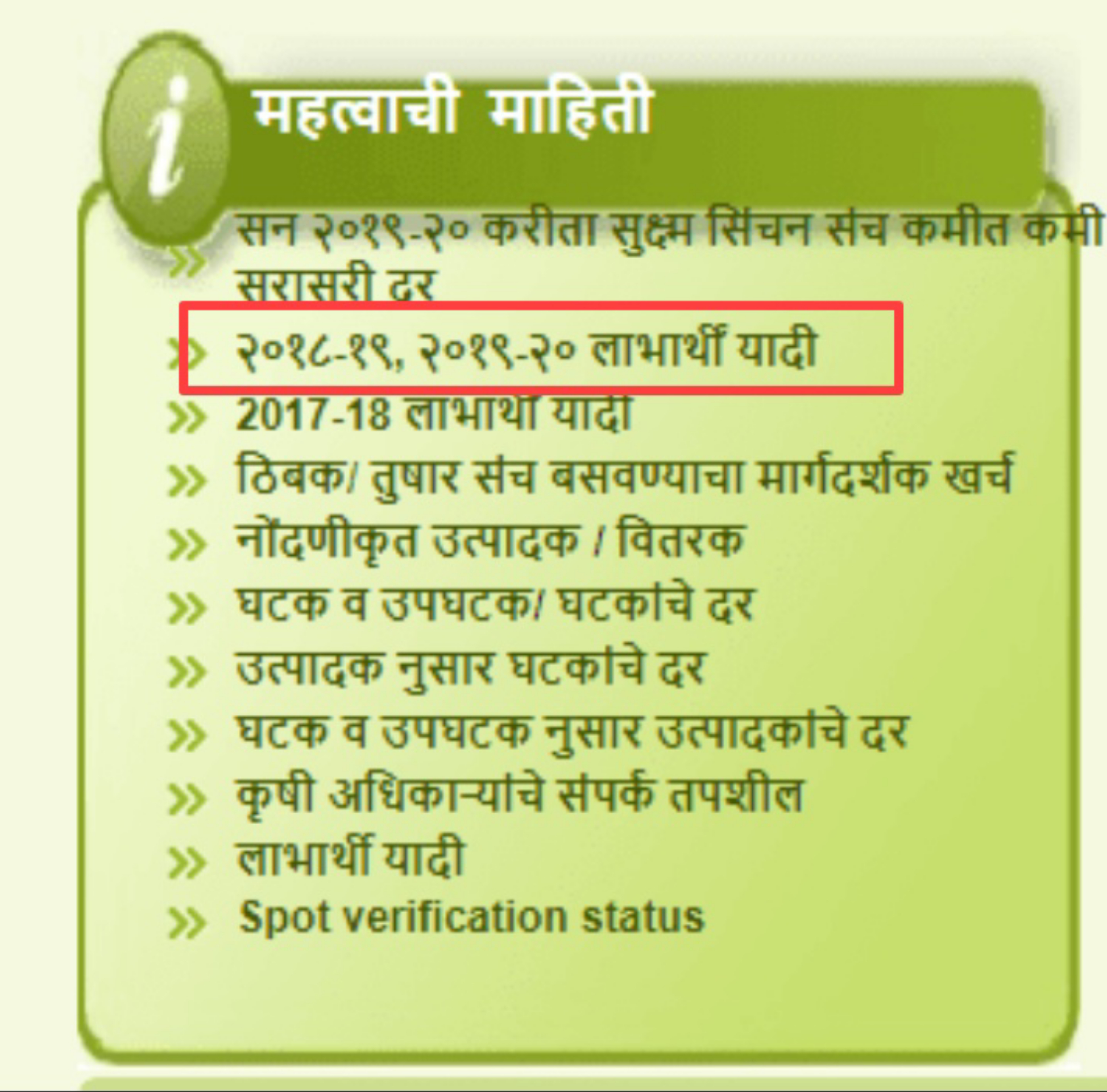 आता तुमच्या समोर सूक्ष्म सिंचन योजना(micro irrigation) ची वेबसाईट open होईल त्यामध्ये “महत्वाची माहिती” या ऑप्शन्स मध्ये “२०१८-१९, २०१९-२० लाभार्थीं यादी” या ऑप्शनवर क्लिक करा.